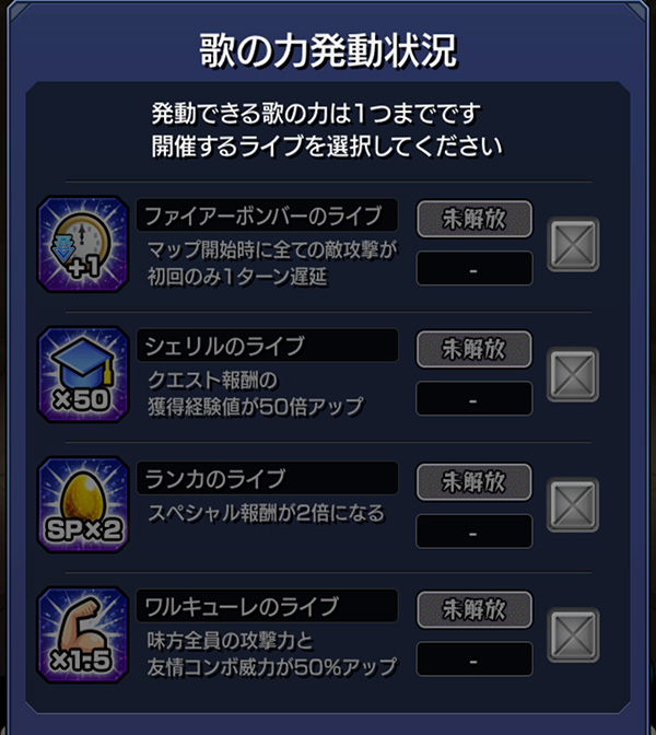 で、5個ともクリアされたライブはそのライブの「歌の力」を使えるようになります。